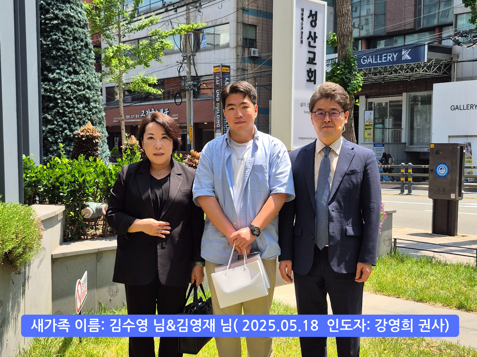 [2025.05.18 등록 새가족] 김수영&김영재 님 작성일25.07.01 10:55 본문 공유 둥록 새가족 : 김수영&김영재 님인도자 : 강영희 권사 이전글[등록 새가족] 황경태 님 25.07.01 다음글[2025.05.11 등록 새가족] 강숙란 님 25.07.01