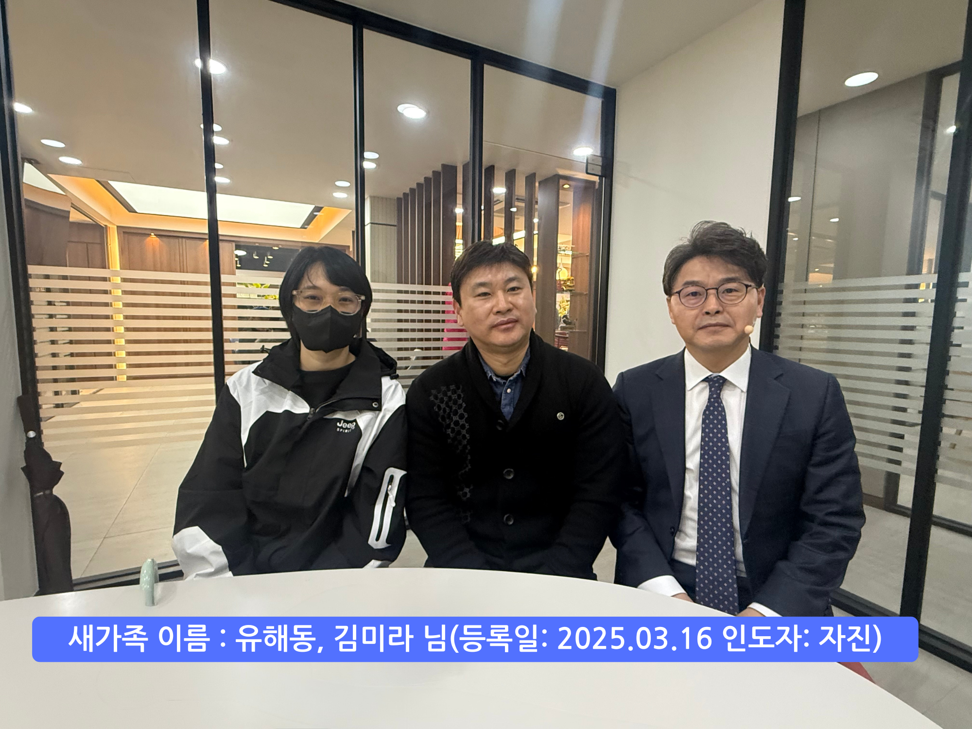 [2025.03.16 등록 새가족] 유해동&김미라 님 작성일25.07.01 10:07 본문 공유 둥록 새가족 :유해동&김미라 님인도자 : 스스로 이전글[2025.03.16 등록 새가족] 정순남 님 25.07.01 다음글[2025.02.02] 새가족교육 수료식 25.07.01
