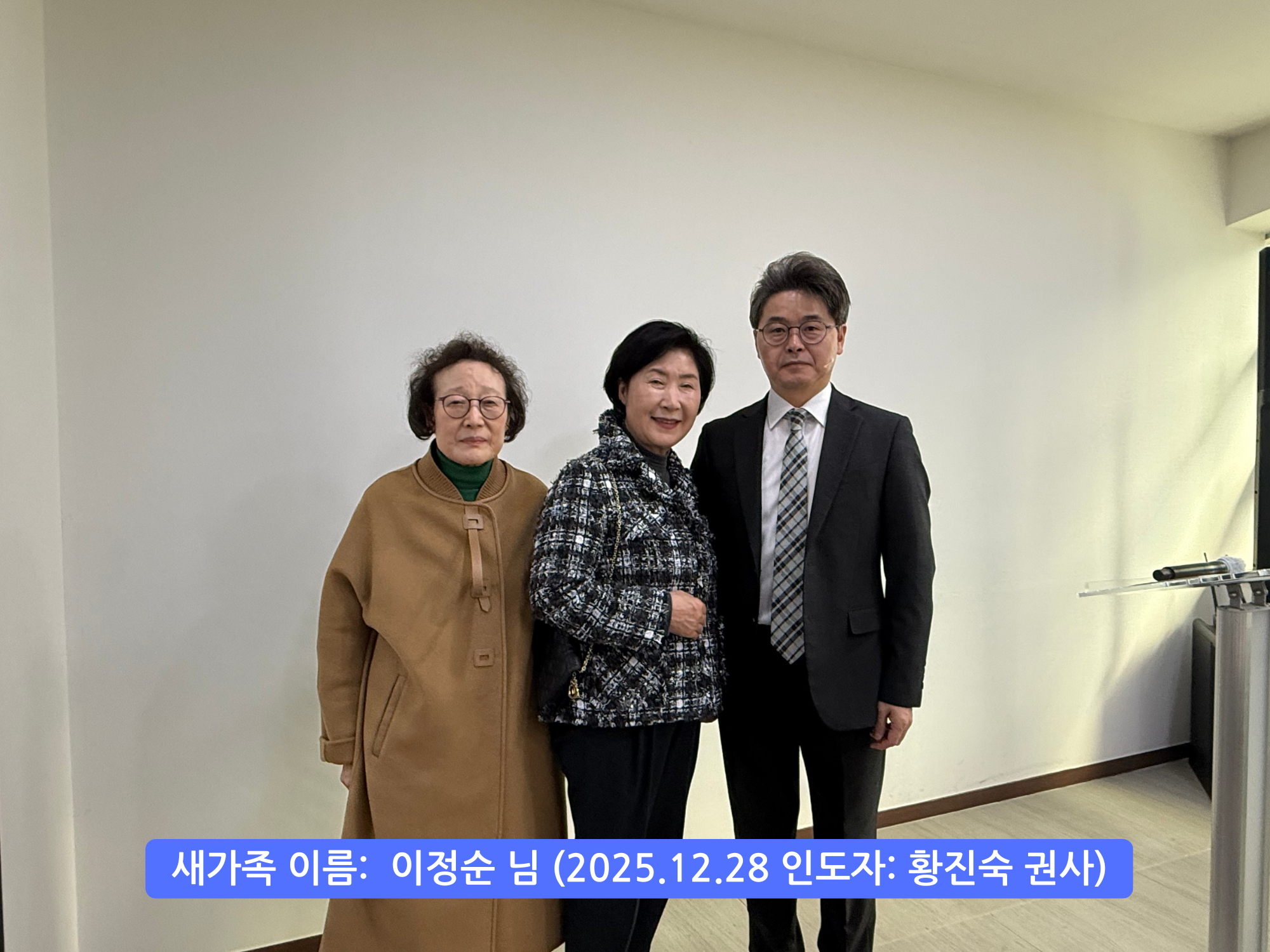 [251228 등록 새가족] 이정순 님 작성일25.12.28 18:44 본문 공유 둥록 새가족 : 이정순 님 인도자 : 황진숙 권사 이전글[251214 등록 새가족] 손영진&김도연 님 26.01.11 다음글[251228 등록 새가족] 곽경희 님 25.12.28