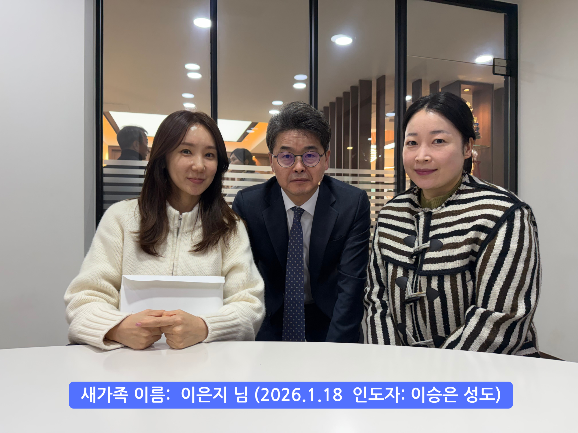 [260118 등록 새가족] 이은지 님 작성일26.01.20 10:54 본문 공유 둥록 새가족 : 아운자 님인도자 : 이승은 성도 이전글[260118 등록 새가족] 이고운 님 26.01.20 다음글[260111 등록 새가족] 노승국&노성희 님 26.01.11