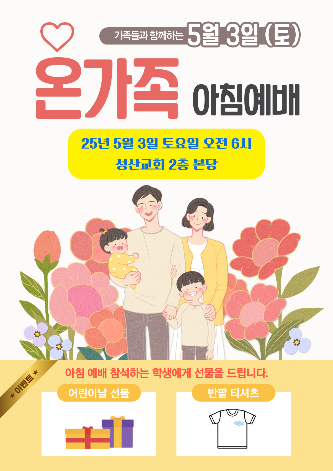온 가족 아침예배 페이지 정보 작성자최고관리자 댓글0건 조회803회 작성일25.05.02 13:31 본문 공유 온가족 아침예배일시: 5월 3일(토) 오전 6시장소: 성산교회 2층 본당 이전글예수님의 사랑으로 물들이는 가정 행사 25.05.02 다음글[주보광고] 2025년 4월 27일 25.04.26 댓글 0 댓글목록 등록된 댓글이 없습니다.