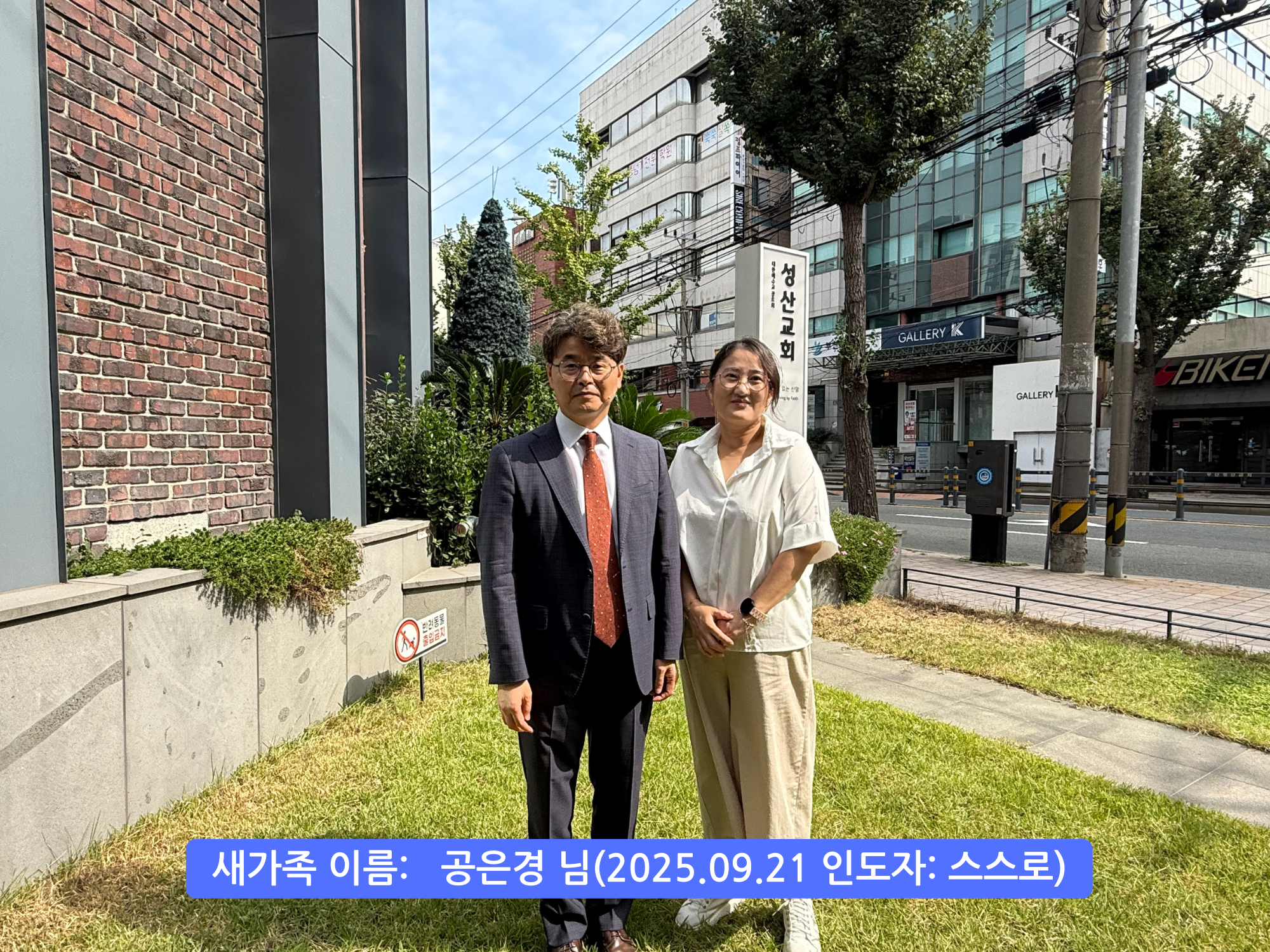 [250921 등록 새가족] 공은경 님 작성일25.09.21 17:44 본문 공유 둥록 새가족 : 공은 경 님인도자 : 스스로 이전글[251012 등록 새가족] 김선중 님 25.10.12 다음글[2025.09.07] 새가족 수료식 25.09.12