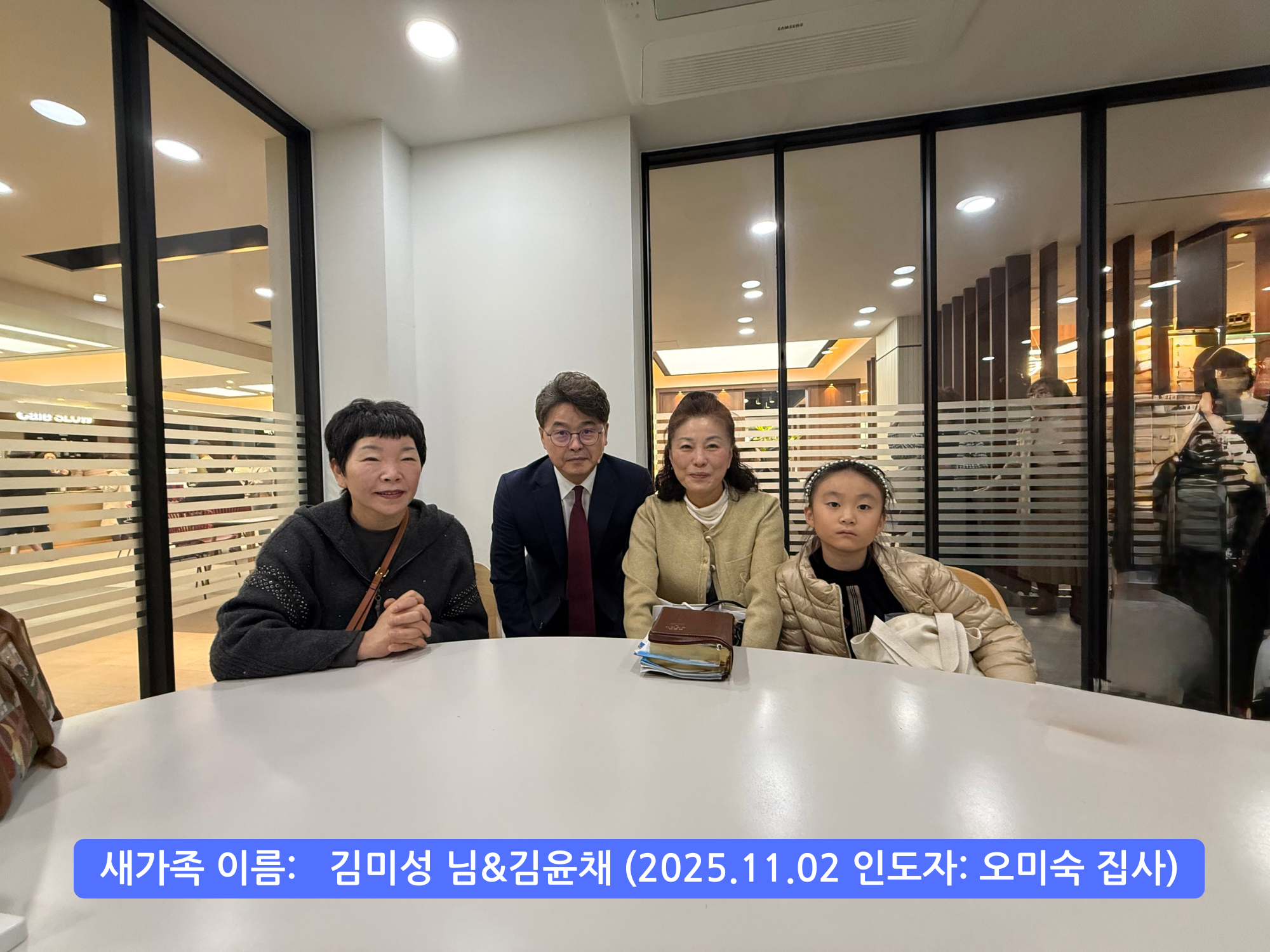 [251102 등록 새가족] 김미성 님 작성일25.11.02 17:49 본문 공유 둥록 새가족 : 김미성 님인도자 : 오미숙 집사 이전글[251109 등록 새가족] 김경선 님 25.11.09 다음글[251019 등록 새가족] 김하정 님 25.10.19