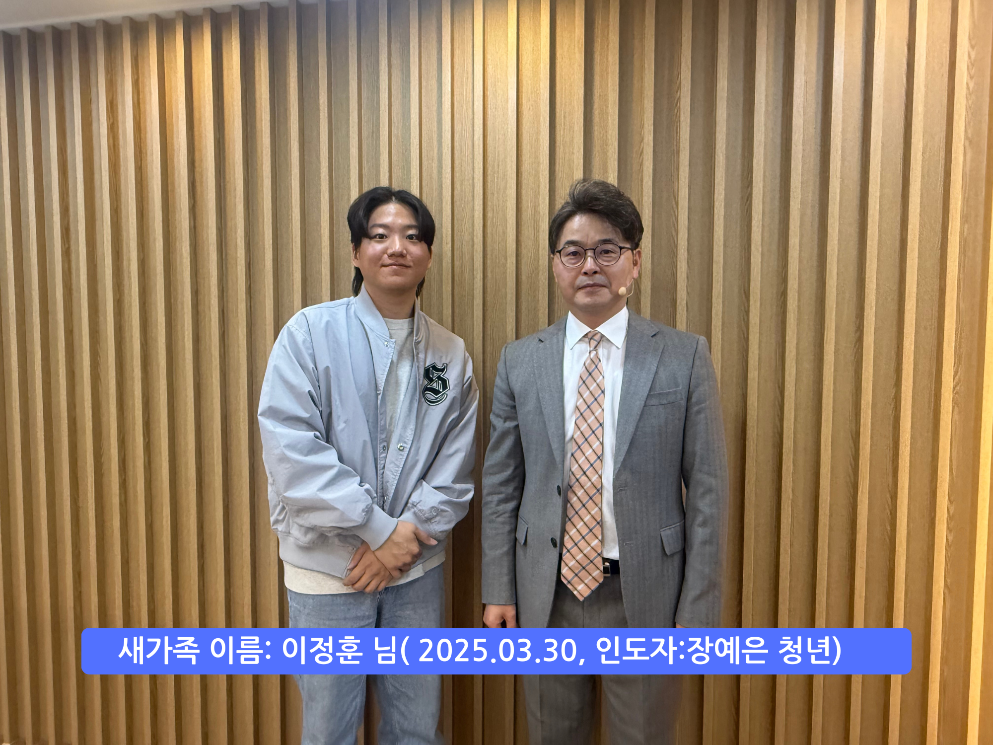 [2025.03.30 등록 새가족] 이정훈 님 작성일25.07.01 10:22 본문 공유 둥록 새가족 : 이정훈 청년인도자 : 장예은 청년 이전글[2025.04.06 등록 새가족] 정철주&신금숙 님 25.07.01 다음글[2025.03.23 등록 새가족] 김 영 님 25.07.01