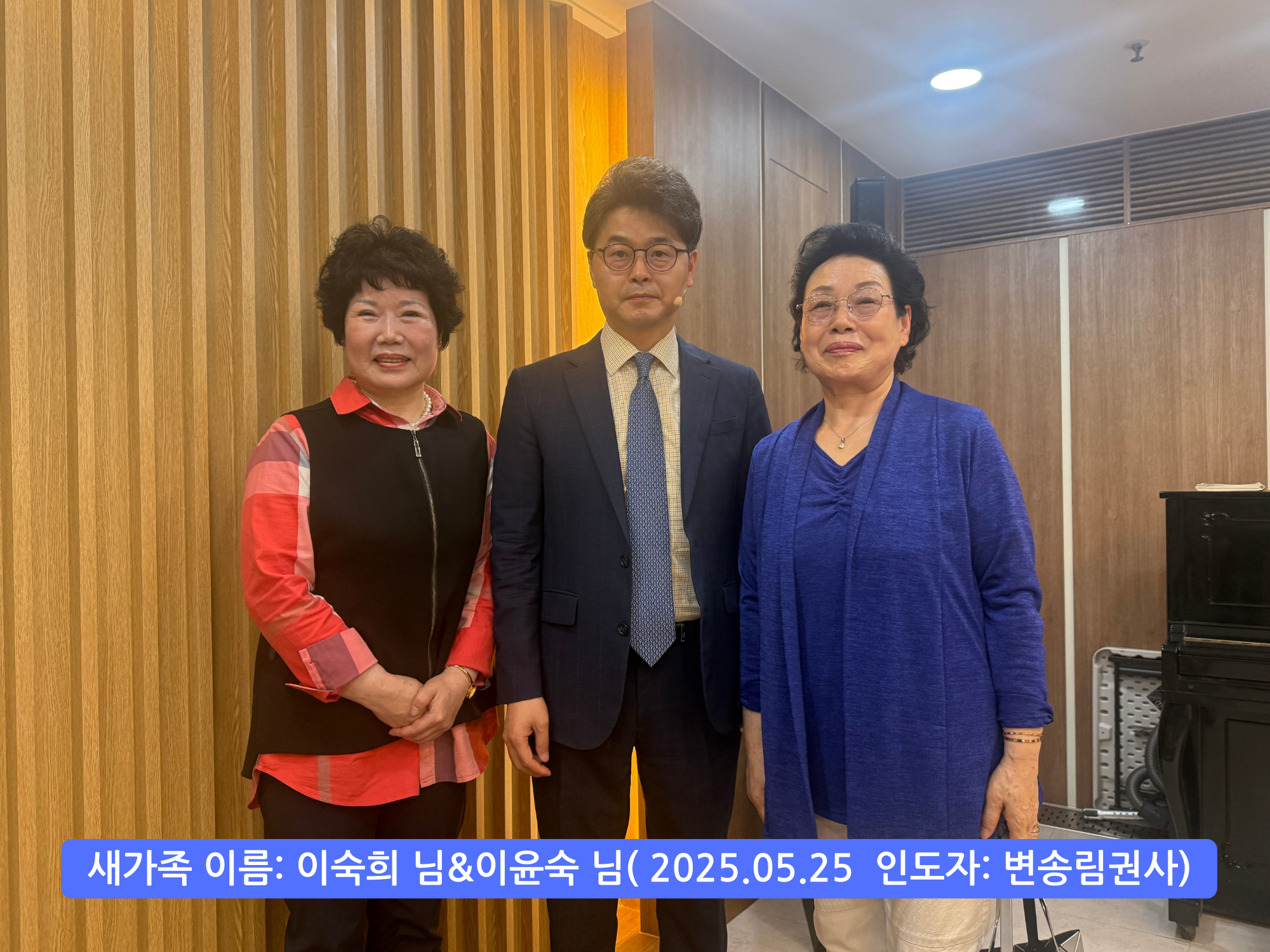 [2025.05.25 등록 새가족] 이숙희&이윤숙 님 작성일25.07.01 11:02 본문 공유 둥록 새가족 : 이숙희&이윤숙 님인도자 : 변송림 권사 이전글[2025.05.25 등록 새가족] 황용태 님 25.07.01 다음글[2025.05.25 등록 새가족] 지성원 님 25.07.01