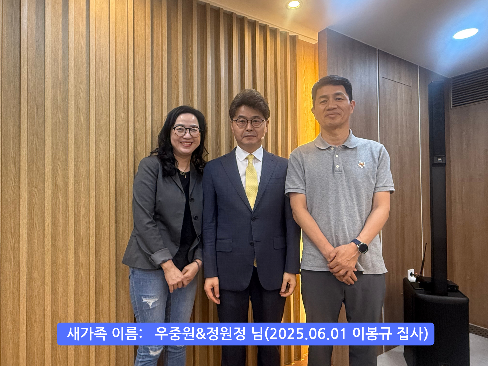 [2025.06.01 등록 새가족] 우중원&정원정 님 작성일25.07.01 11:18 본문 공유 둥록 새가족 : 우중원&정원정 님인도자 : 이봉규 집사 이전글[2025.05.25 등록 새가족] 정민우&최혜원 님 25.07.01 다음글[2025.06.01 등록 새가족] 강순진 님 25.07.01