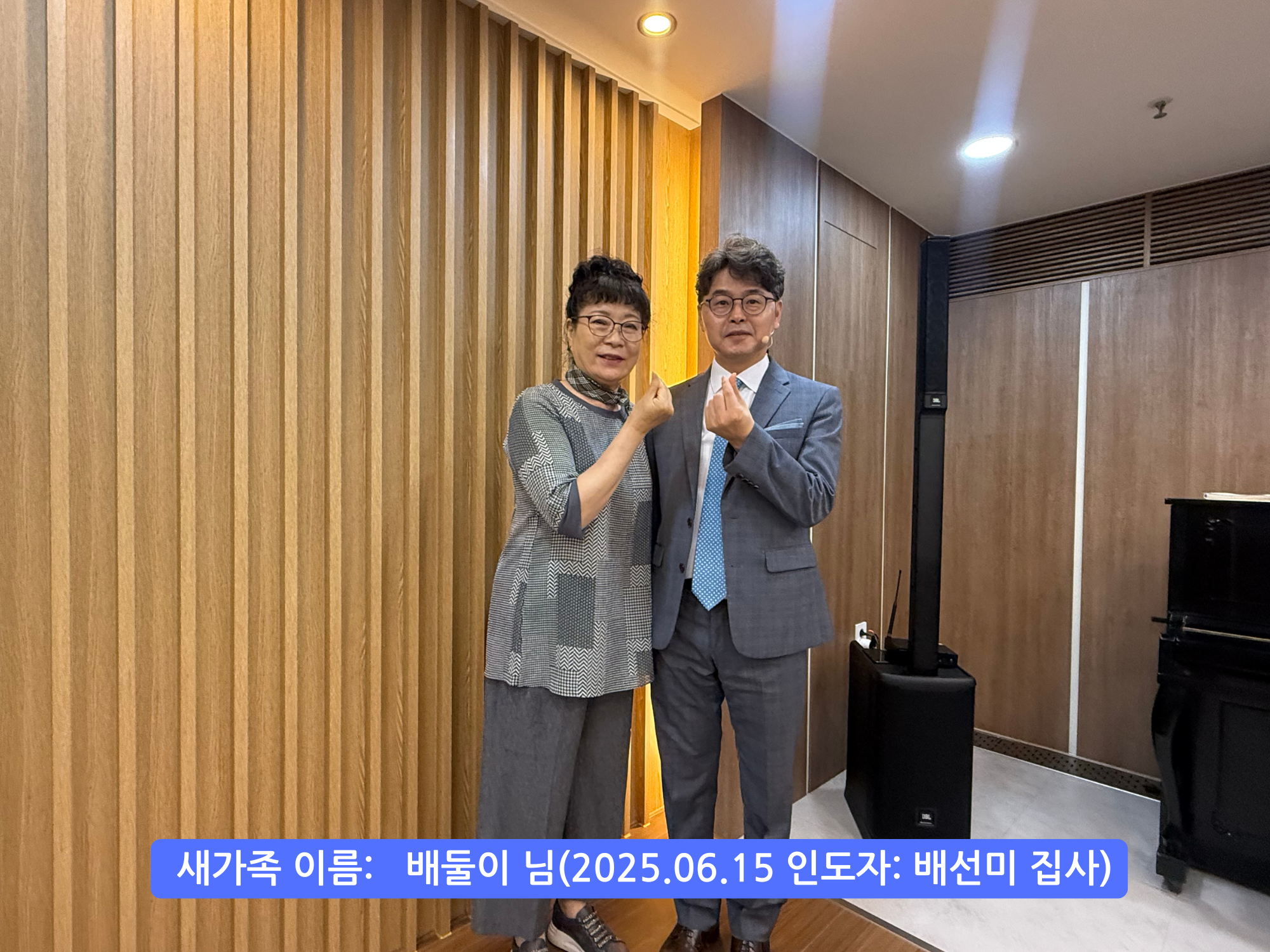 [2025.06.15 등록 새가족] 배둘이 님 작성일25.07.01 11:34 본문 공유 둥록 새가족 : 배둘이 님인도자 : 배선미 집사 이전글[2025.06.22 등록 새가족] 최동희 님 25.07.01 다음글ㅔ2025.06.08 등록 새가족] 황세은 님 25.07.01