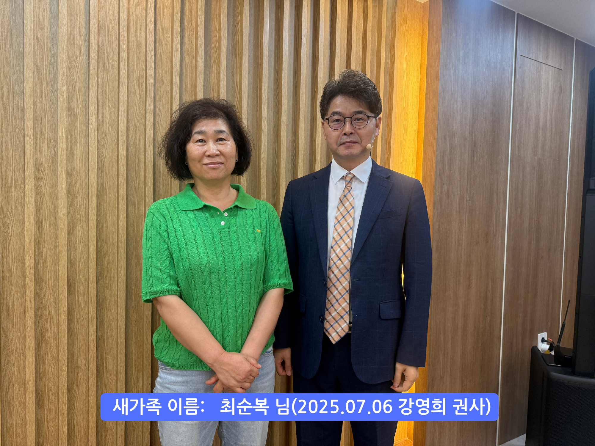 [250706 등록 새가족] 최순복 님 작성일25.07.06 17:31 본문 공유 둥록 새가족 : 최순복 님인도자 : 강영희 권사 이전글[250706 등록 새가족] 김채원 님 25.07.06 다음글[250706 등록 새가족] 주현미&이세범 님 25.07.06