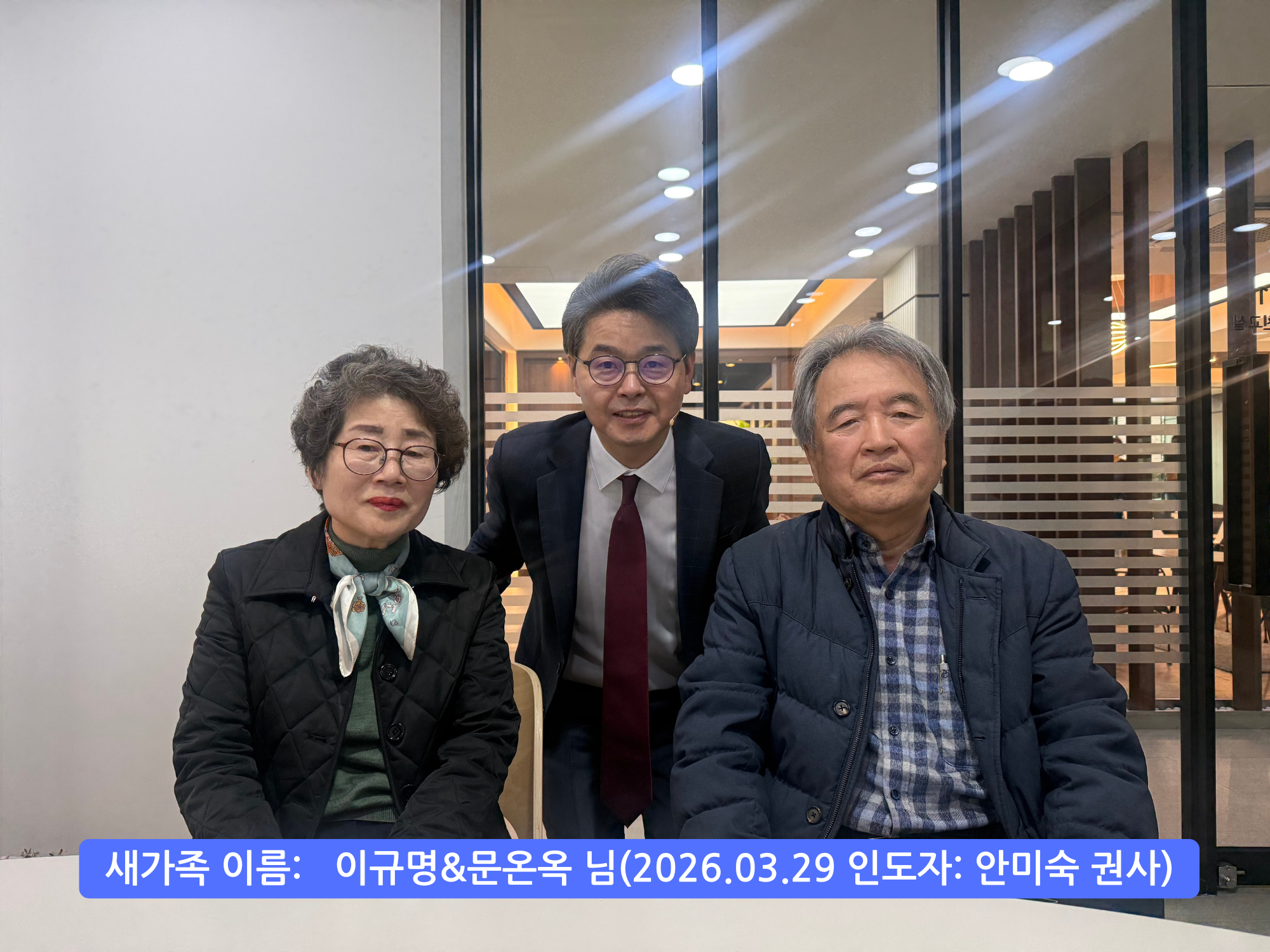 [260329 등록 새가족] 이규명&문온옥 님 작성일26.03.29 16:15 본문 공유 둥록 새가족 : 이규명&문온옥 님인도자 : 안미숙 권사 이전글[260329 등록 새가족] 윤복희 님 26.03.29 다음글[260322 등록 새가족] 조성규&김영미&조건희 님 26.03.22